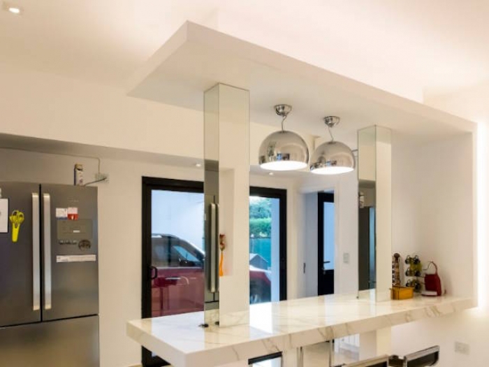 Finalmente y como frutilla de la torta, la iluminación juega un rol fundamental en este proyecto debido que se dispuso la utilización de iluminación gélida, cálida, y en algunos sectores (fundamentalmente los sociales) el uso de luces led rgb, las cuales nos permite que los mismo espacios puedan ser vividos de diferentes maneras de acuerdo al color dispuesto por el comitente o por la ocasión requerida convirtiendo a esta casa no solo en un resguardo para vivir sino también en una caja contenedora de emociones sensiblemente modificables.